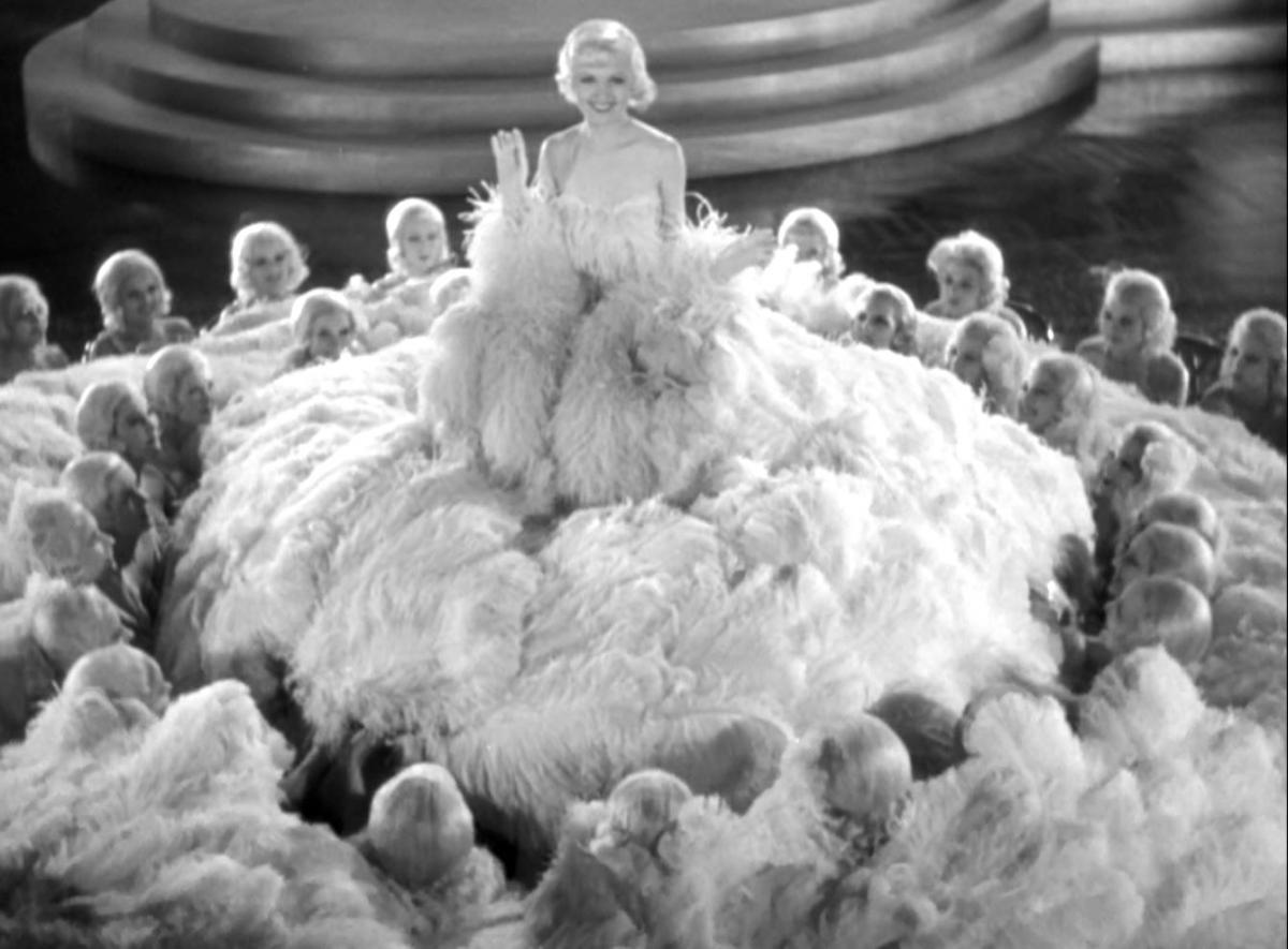 How to deal with the failure of Powell’s latest scheme? Why, of course, he must mount a musical revue! This is where Fashions of 1934 asserts its claim as a musical: the story culminates in a single Busby Berkeley production number, as gaudy and spectacular as one might expect from Berkeley. The song is “Spin a Little Web of Dreams,” a pleasant number by Sammy Fain and Irving Kahal (the studio’s A songwriting team, Al Dubin and Harry Warren, presumably being busy elsewhere). The singer is the aforementioned fake countess, played by Verree Teasdale, who is fortunately an excellent singer. But the focus, as so often, is on the sheer excess of Berkeley’s imagination. Powell, in the story, has stumbled onto access to an unlimited supply of ostrich feathers, so the number is awash in an endless sea of ostrich feathers. The spectacle makes a hit with the onscreen audience, finally sealing the success of Powell’s enterprise—or, at least, allowing him to make a comfortable getaway with Bette Davis at film’s end.