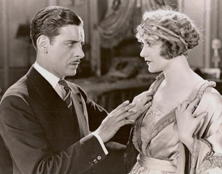 She’s cast as an American heiress, traveling abroad with her wealthy father. Having been besieged by a long line of fortune hunters, she’s soured on the male sex at large. She’s at pains to dress and behave as awkwardly and unappealingly as possible, and announces that she wants to avoid all men. That resolve vanishes instantly when she meets dashing Ronald Colman, the film’s leading man. Colman, of course, would go on to become one of the biggest stars in Hollywood history, with a career that extended far into the sound era.